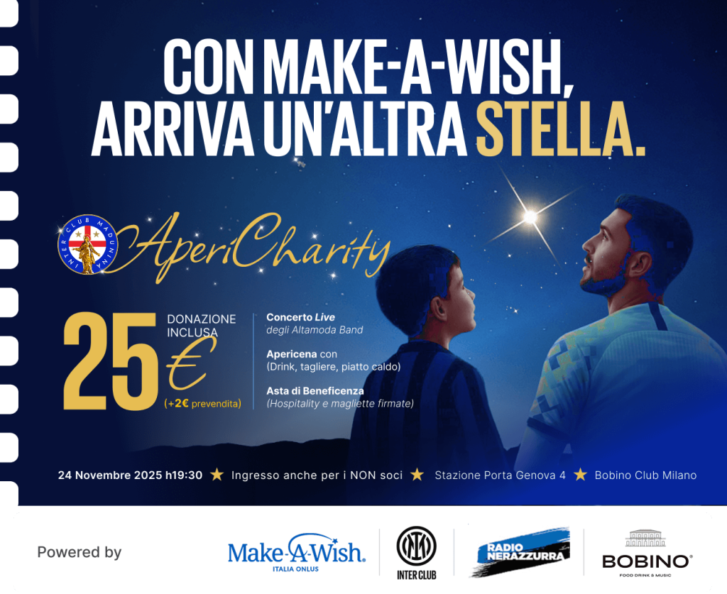 Lunedì 24 novembre, dalle 19.30, al Bobino Club, appuntamento con la Charity Night firmata Inter Club Madunina e Make-A-Wish Italia!